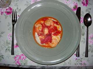 Hmmm…I am not sure if this looks like what it really is…it is Shrimp And Grits from the Tupelo Honey Cafe Cookbook!!!  It was amazing and my husband loved it and is begging me to make it again, soon!!!  The shrimp is cooked with roasted red peppers and a bit of fresh garlic and wine and a teeny bit of butter.  The grits part is made with grits and a little cream and goat cheese.  It was our Friday Night Lent Supper…and it was yummy.  The red part is not oil…it is just a yummy juice made from the roasted peppers and the wine and butter.  It was actually not even difficult to make.  I prepped everything early in the day…and dinner took minutes.
