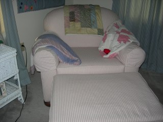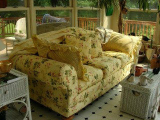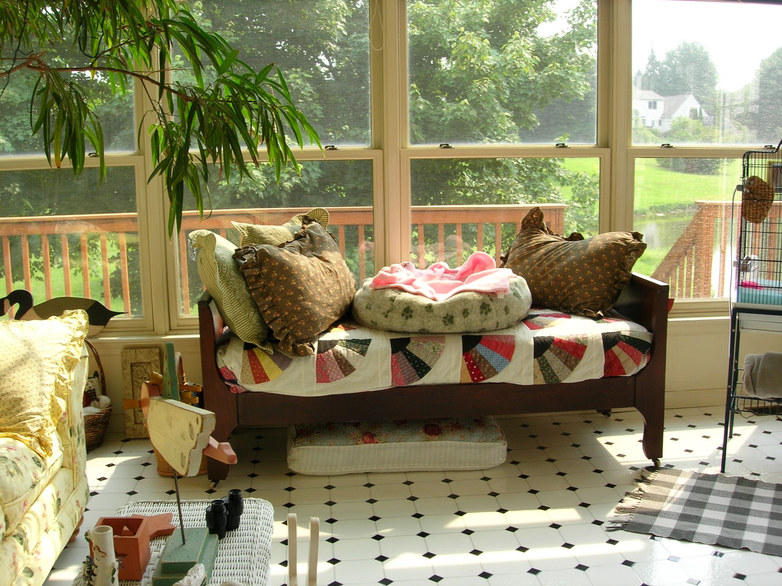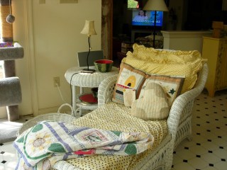 Love all your lounging areas, love the bright sunny colored sofa, and the wicker chair…actually, I love them all, Patty. With comfy lounger like this, I would be reading all the time, and loving it!